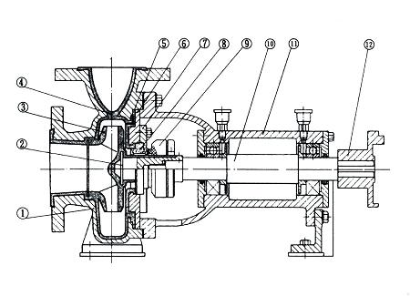 IHF為單級單吸式氟塑料合金化工離心泵,該泵是按照標(biāo)準(zhǔn)并結(jié)合非金屬泵的加工工藝設(shè)計生產(chǎn)。泵體采用金屬外殼內(nèi)襯聚全氟乙丙烯(F46),泵蓋、葉輪和軸套均用金屬嵌件外包氟塑料整體燒結(jié)壓制成型,軸封采用四氟填充材料,進(jìn)出口均采用鑄鋼體加固。